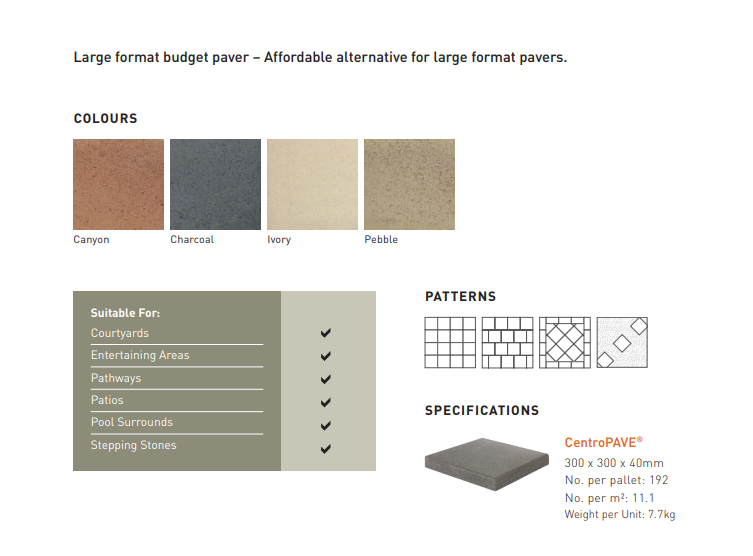 Suitable: Patios, Courtyards, Steppers, Pool Surrounds, Entertaining Areas, Pathways