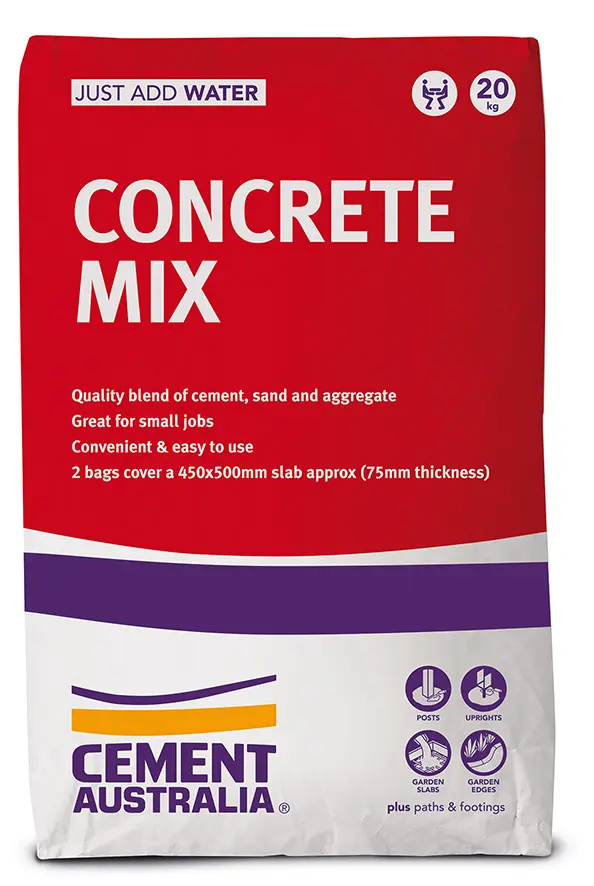Concrete Mix is a quality blend of cement, sand and aggregates , designed for small projects around the home or garden. Its versatility allows it to be used for garden edges, mower strips, paths, garden slabs, foundations, footings, posts and uprights for pergolas.