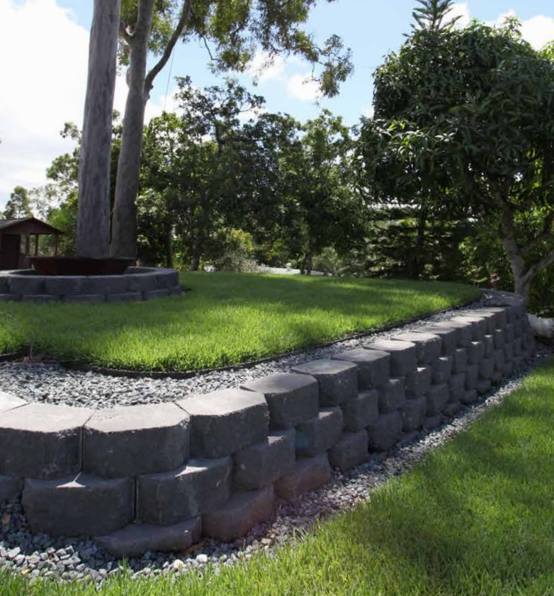 Suitable: High retaining walls, garden beds, garden edging, splitface, step back, straight walls, curved walls